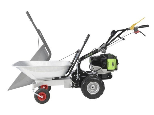 De motorkruiwagen heeft een laadvermogen van 75 kg en een gegalvaniseerde plaatstalen bak van 85 liter met geïntegreerd kipsysteem.