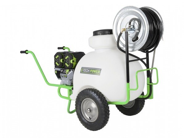 De E-Tech Power sproeier is gebouwd met een robuuste polyethyleen tank van 100 liter. De machine is standaard uitgerust met een 25 meter lange slanghaspel en een spuitlans, waardoor je direct aan de slag kunt.