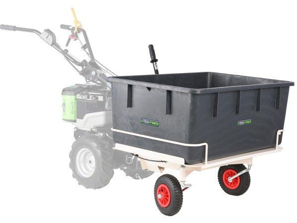 De E-Tech Power E-T-MU TR160 is een transportwagen-accessoire voor de MULTI EGO multifunctionele basismachine, uitgerust met een snelkoppelingssysteem voor eenvoudig gebruik. Dankzij zijn laadcapaciteit van 75 kg en de kunststof tank van 160 liter is dit accessoire ideaal voor het vervoeren van volumineuze ladingen of materialen die een vlak platform vereisen.