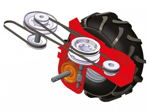 De overbrenging naar de wielen gebeurt met een eindeloze schroef in oliebad, terwijl de maaibalk wordt aangedreven door riemen.