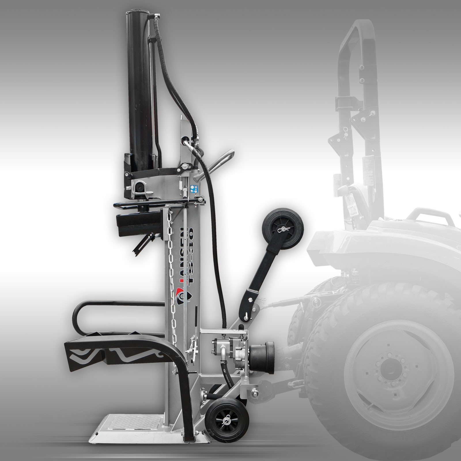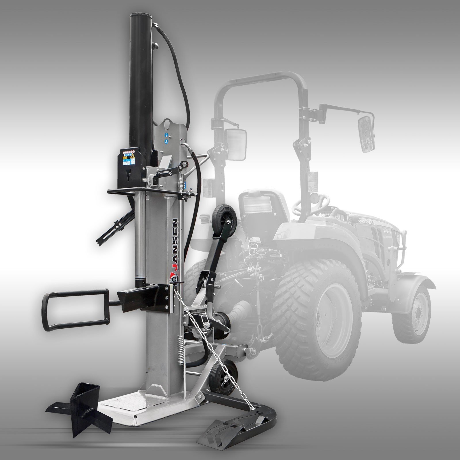 De Jansen TS-30 houtklover is een robuuste machine met een gewicht van 370 kg, vervaardigd volgens de nieuwste Europese veiligheidsnorm EN 609:2017. De kloofmachine genereert een splijtdruk van 30 ton door middel van een trekker/tractor (aandrijving via de aftakas, niet inbegrepen).