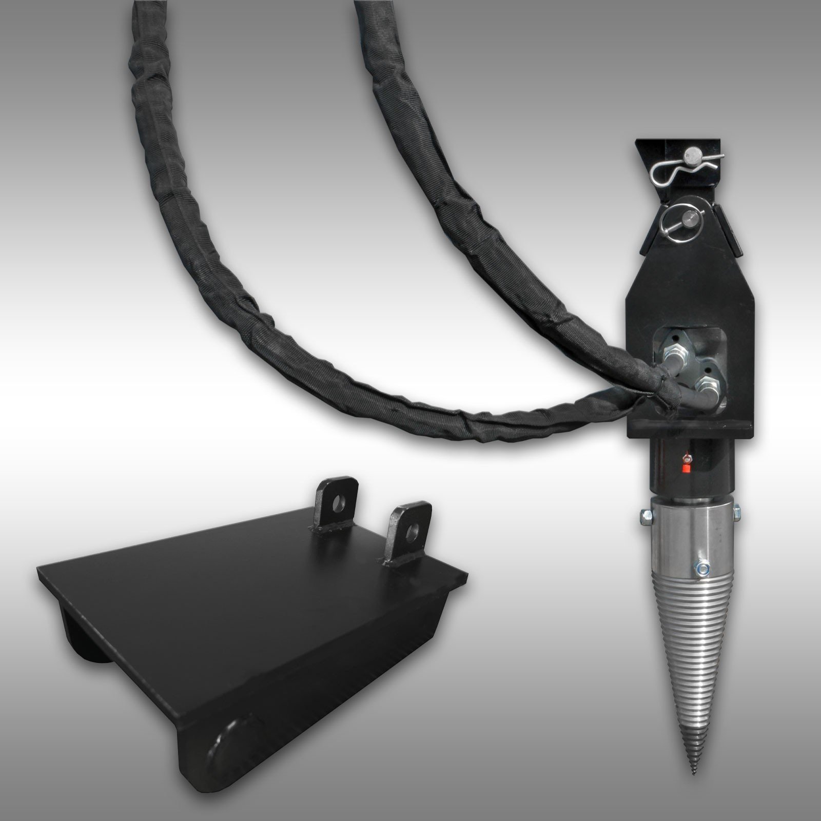 De Jansen JSK-350 kegelsplijter met een 350 mm splijtkegel en MS-01 opname is ontworpen voor bevestiging aan uw minigraafmachine. Het biedt een veilige en efficiënte manier om boomstammen en boomwortels te splijten.