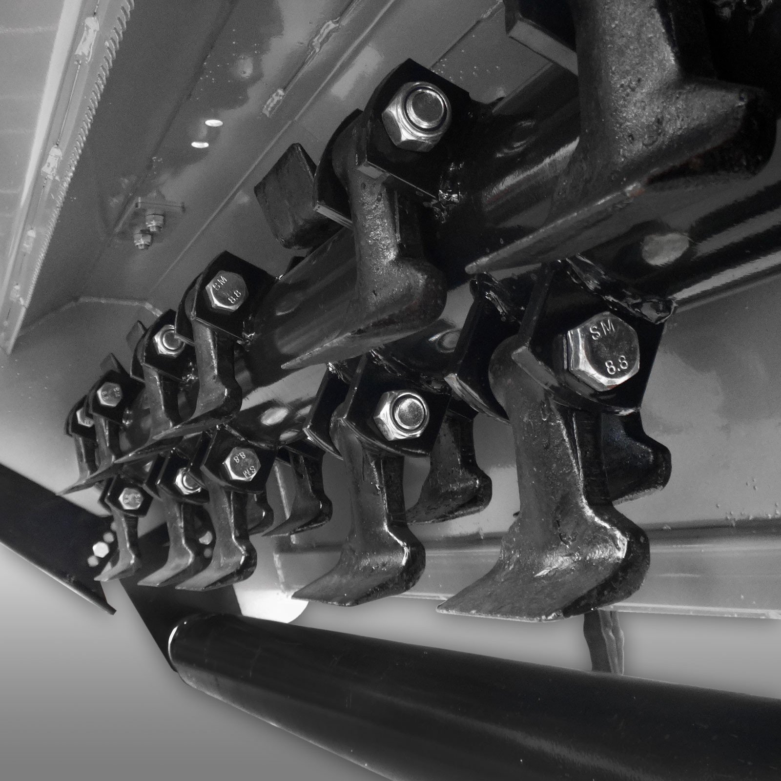 De klepelmaaier is voorzien van 22 speciaal geharde hamermessen van 0,8 kg per stuk. Deze messen versnipperen het materiaal zeer fijn. De dubbele spiraalrotor zorgt voor een gelijkmatige belasting en een rustige loop, zelfs bij zware omstandigheden.