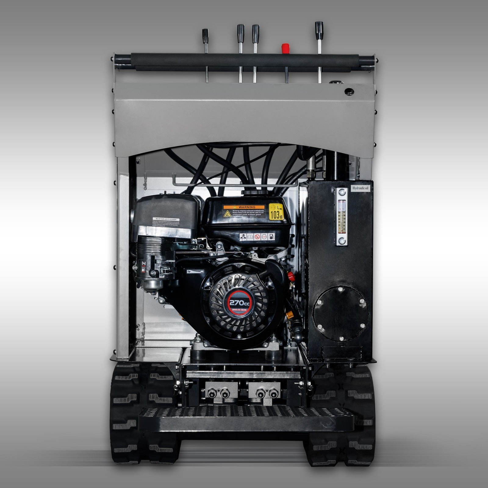 Deze zelfrijdende dumper beschikt over een hydraulisch bediende kiepbak, waardoor laden en lossen snel en efficiënt verloopt. De kiepbak heeft een afmeting van 940x670x640 mm en een kiephoek van meer dan 90 graden, wat het lossen vergemakkelijkt.
