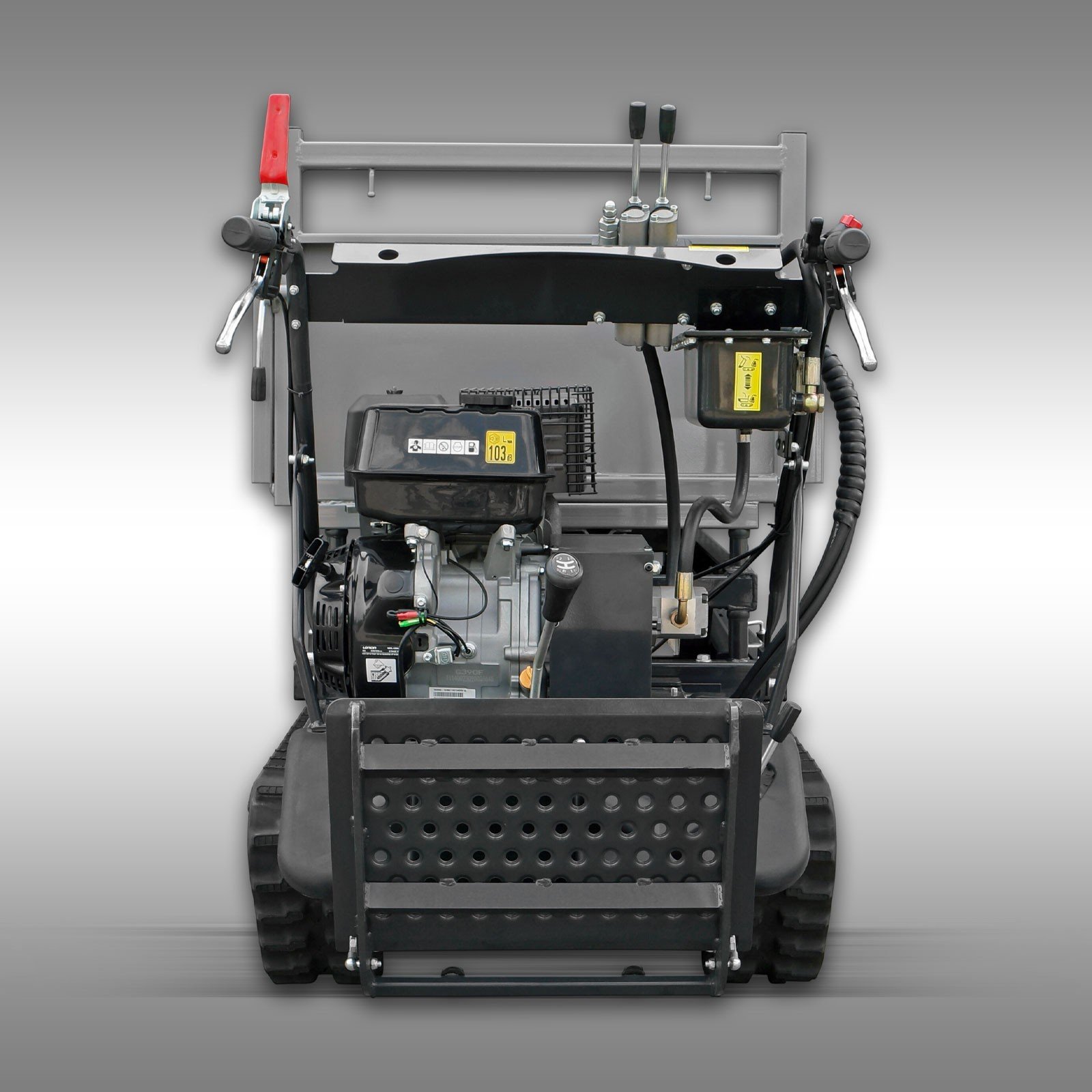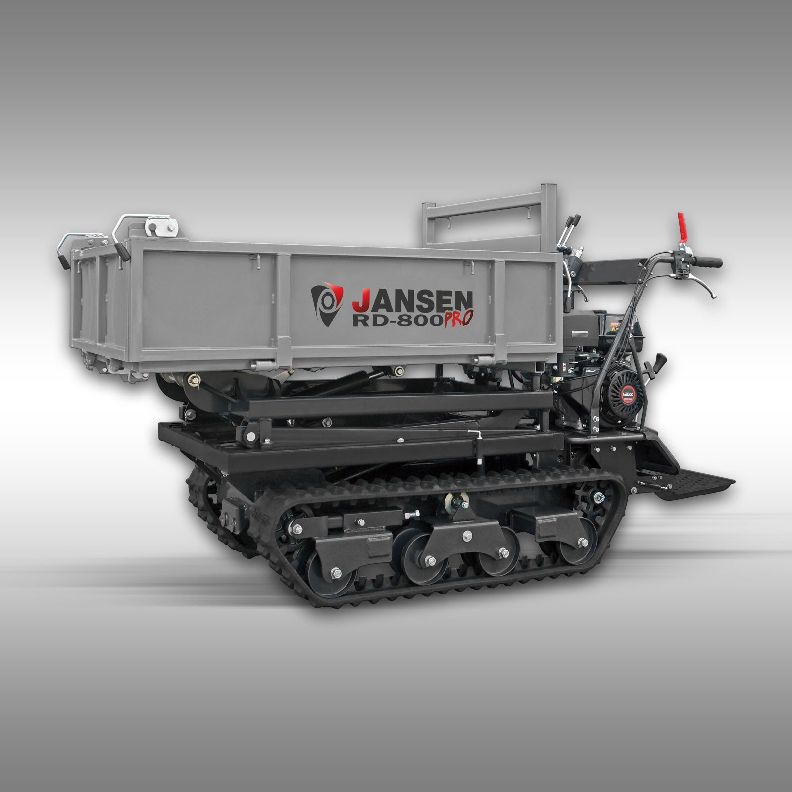 De Jansen RD-800pro rupsdumper is een krachtig en veelzijdig apparaat, ontworpen om zware lasten te vervoeren, zelfs op moeilijk begaanbaar terrein. Het hydraulische hoogkiepsysteem maakt het mogelijk om materialen tot een gewicht van 1000 kg direct in containers, aanhangers of vrachtwagens te laden. De robuuste constructie en de krachtige 15 PK motor zorgen voor betrouwbare prestaties, terwijl de intuïtieve bediening en het inklapbare voetbord het comfort verhogen.