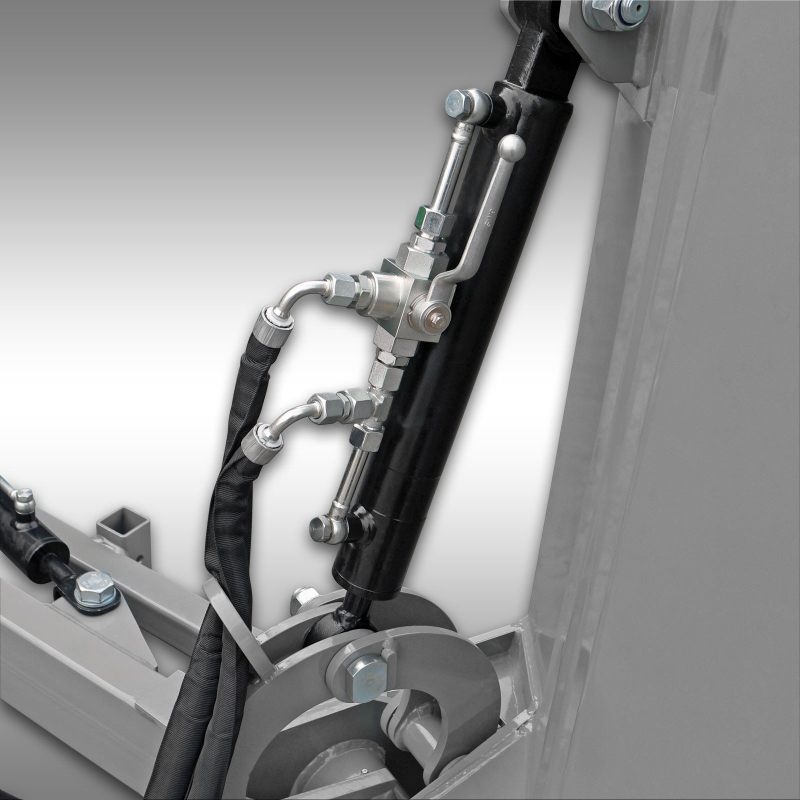 De aandrijving van de taludmaaier verloopt via de meegeleverde aftakas. U heeft twee dubbelwerkende hydraulische aansluitingen nodig voor de bediening. Er is ook een optionele set beschikbaar waarmee u slechts één dubbelwerkende en één 12V-aansluiting nodig heeft (stekker niet inbegrepen).