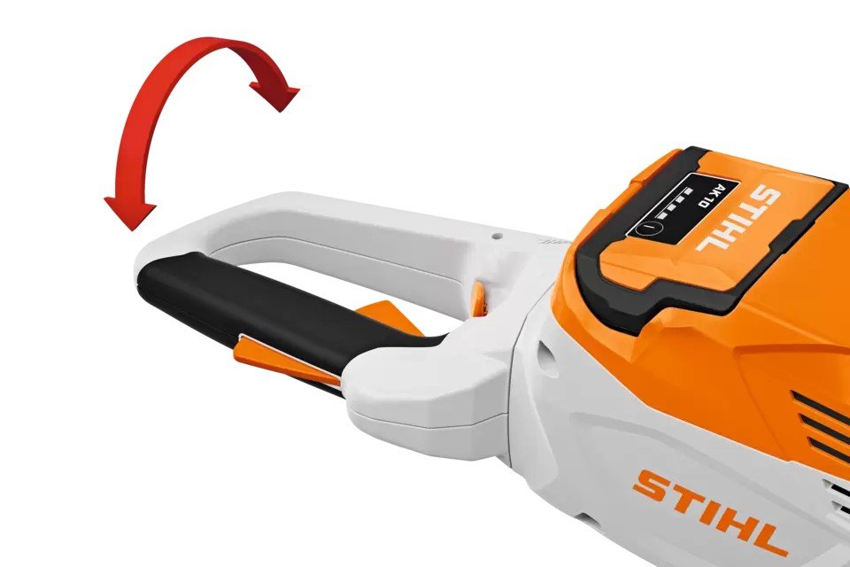 De STIHL HSA 60 maakt indruk met zijn optimale balans en comfortabele, ergonomische bediening. Met een druk op de knop draai je de multifunctionele handgreep 90° naar links of naar rechts. Zo kan je in elke snoeirichting uiterst ergonomisch werken.