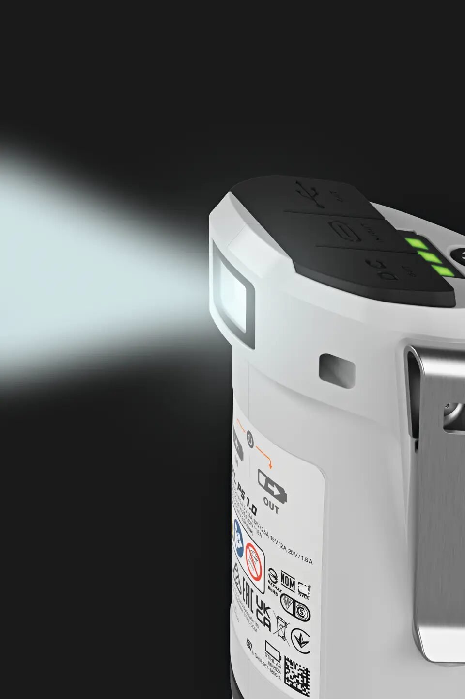 De aparte schakelaars voor de stroomvoorziening en de zaklamp maken de powerbank gebruiksvriendelijk. Bovendien heb je dankzij de led-display voortdurend zicht op de laadstatus. De metalen riemclip maakt het handig om de PS 1 mee te nemen.