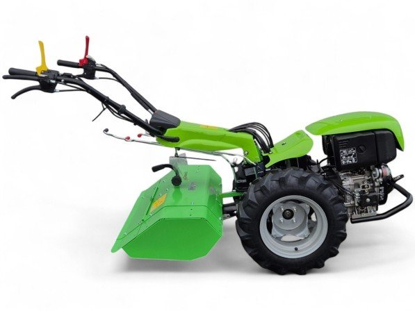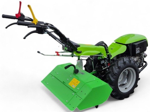 Deze trekker wordt geleverd met een bakfrees van 80 cm, aanpasbaar tot 50 cm, en grote wielen met regelbare flenzen. Dit maakt de machine geschikt voor een breed scala aan toepassingen in de tuin- en landbouw.