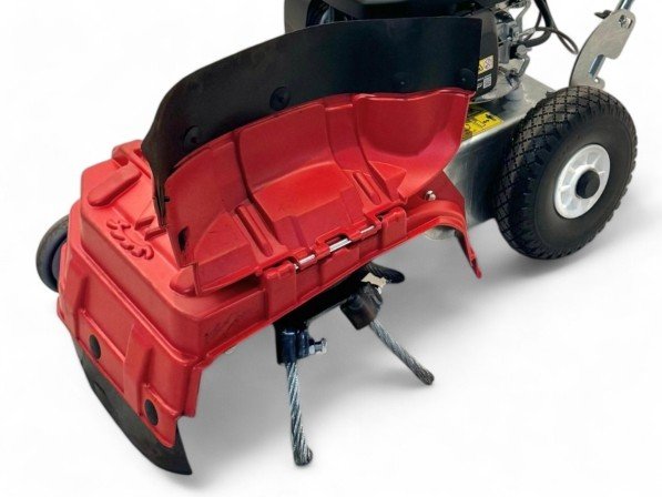 Een deel van de beschermkap kan omhoog gezet worden. Dit maakt het mogelijk om dicht langs muren en andere obstakels te werken, waardoor geen enkel stukje onkruid overgeslagen wordt.